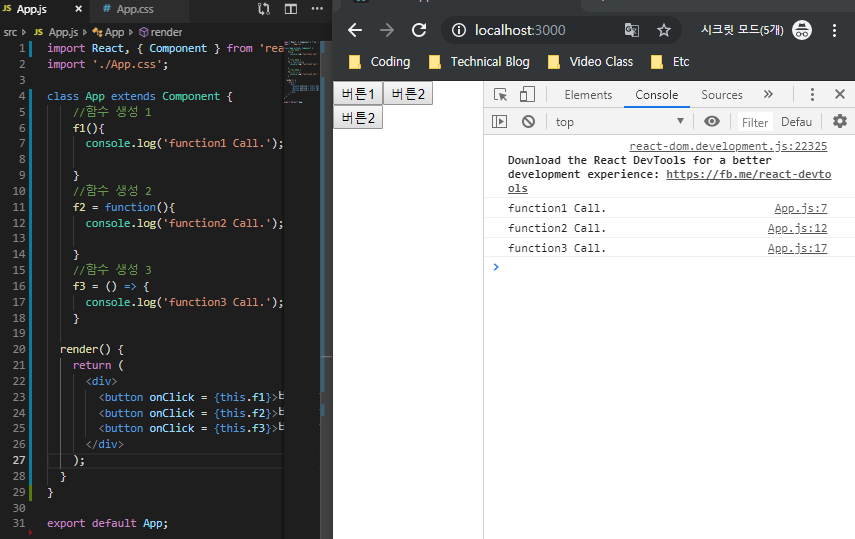 이번엔 JSX에서 버튼 태그를 생성하여 함수를 호출할 수 있도록 해보자.