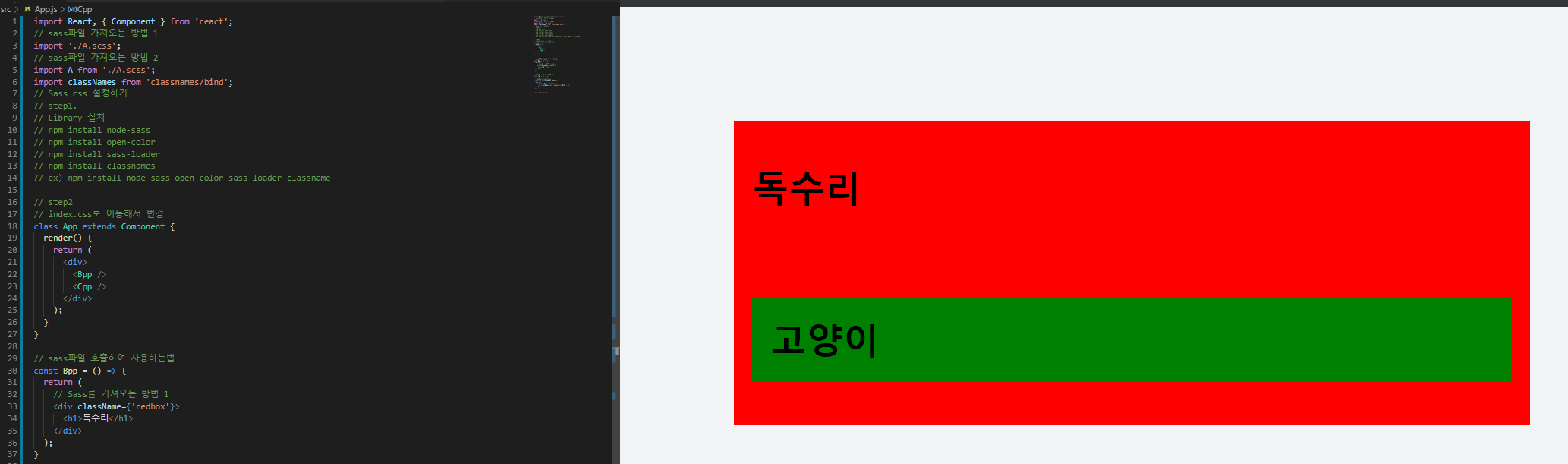 우선 에러가 발생할 텐데, index.js에 들어가 'import './index.css';' 를 'import './index.scss';' 로 변경한다.