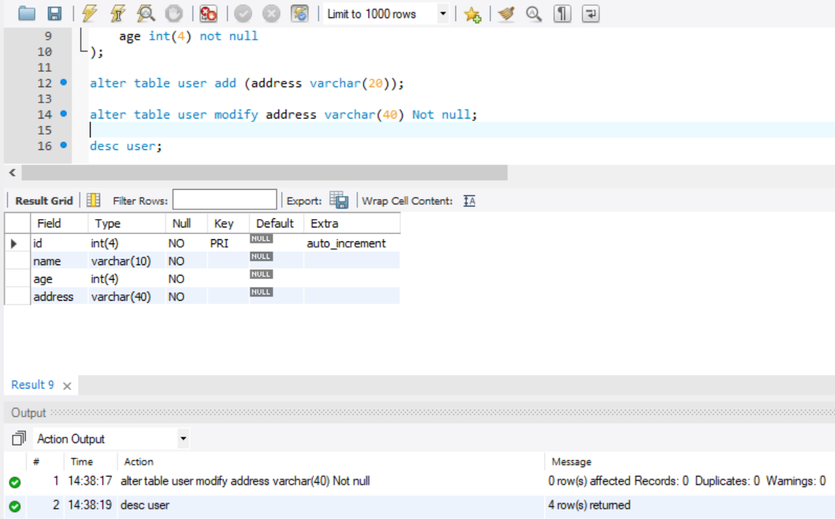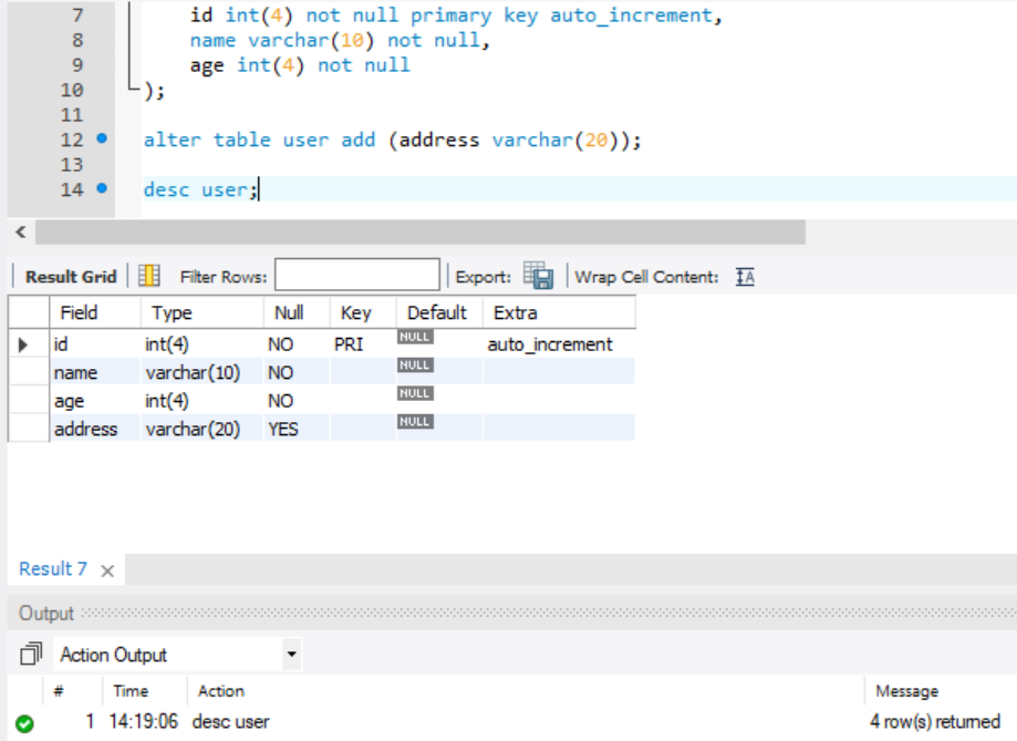 위에서 생성했던 user 테이블에 address 란 새로운 Column을 추가해보자.