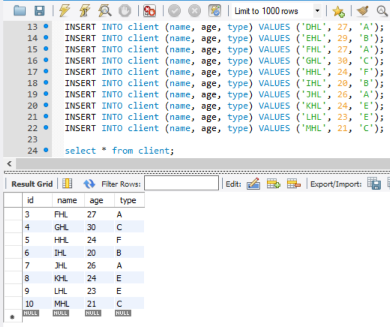 INSERT INTO client (name, age, type) VALUES ('IHL', 20, 'B');