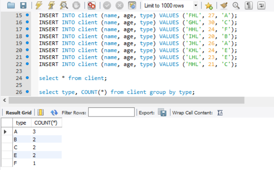 select type, COUNT(*) from client group by type;