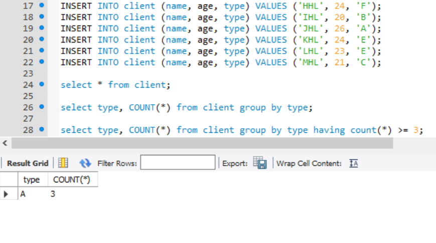 INSERT INTO client (name, age, type) VALUES ('HHL', 24, 'F');