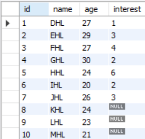 INSERT INTO client (name, age, interest) VALUES ('MHL', 21, NULL);